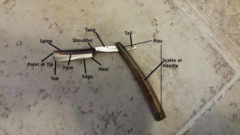 - And finally, you need a razor! Here's the trick with shopping for a straight razor, beware of kitsch! As with any "old world" tools, there are always people out there to sell you "gift" versions (aka. junk that looks pretty). You can get a good idea of what sharp, shave-worthy razors should cost and look like on www.straightrazordesigns.com. They cost a lot, have a sensible blade size (generally 5/8") and will be something you can pass down to your daughter (which may make your great grandfather roll over in his grave). As I have stated previously, however, I am cheap. No way am I spending $150-$200 to shave my legs when I'm paring down my life and trying to live simply. It just would feel weird to me. I will say that if you get a quality razor from there or a number of other shops (some of the same razors are also on Amazon for a bit cheaper), you will know that you got the right one, and you will know what sharp is supposed to be like. My way is more fun, cost effective and gets you something just as good, but takes more care, research and possibly haggling to get there. You also need to really know what you are doing with a hone. So, what I did was poked around the bins at antique shops that didn't specialize in shaving gear until I found a razor that had a gorgeous (but slightly cosmetically scratched) blade and a deteriorating but serviceable handle that is very high quality--for less than $4. No matter which way you do it, you still need to have some idea what you are looking at, so allow me to give you a brief rundown on that. First, a really quick and dirty guide to a razor's parts: